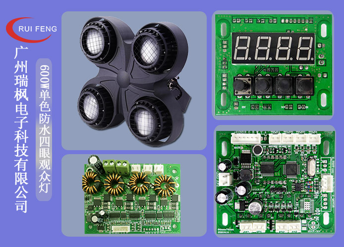 600W单色防水四眼观众灯,平滑调光,智能风扇及温度控制。